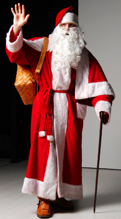 Bestellen Sie den echten finnischen Weihnachtsmann mit Lappland-Stiefeln und Birkenrinderucksack.